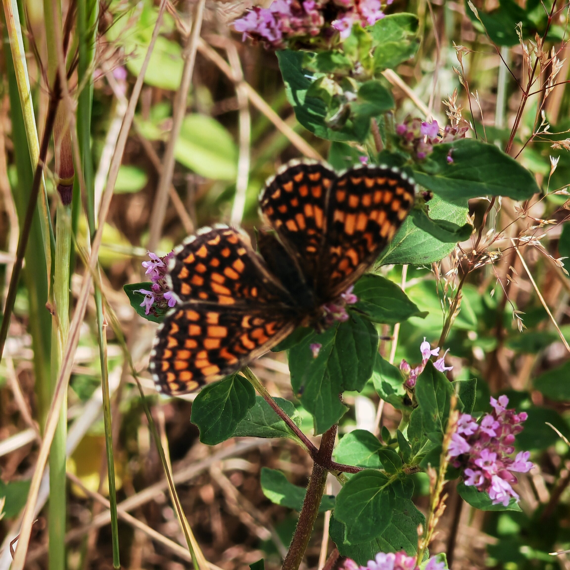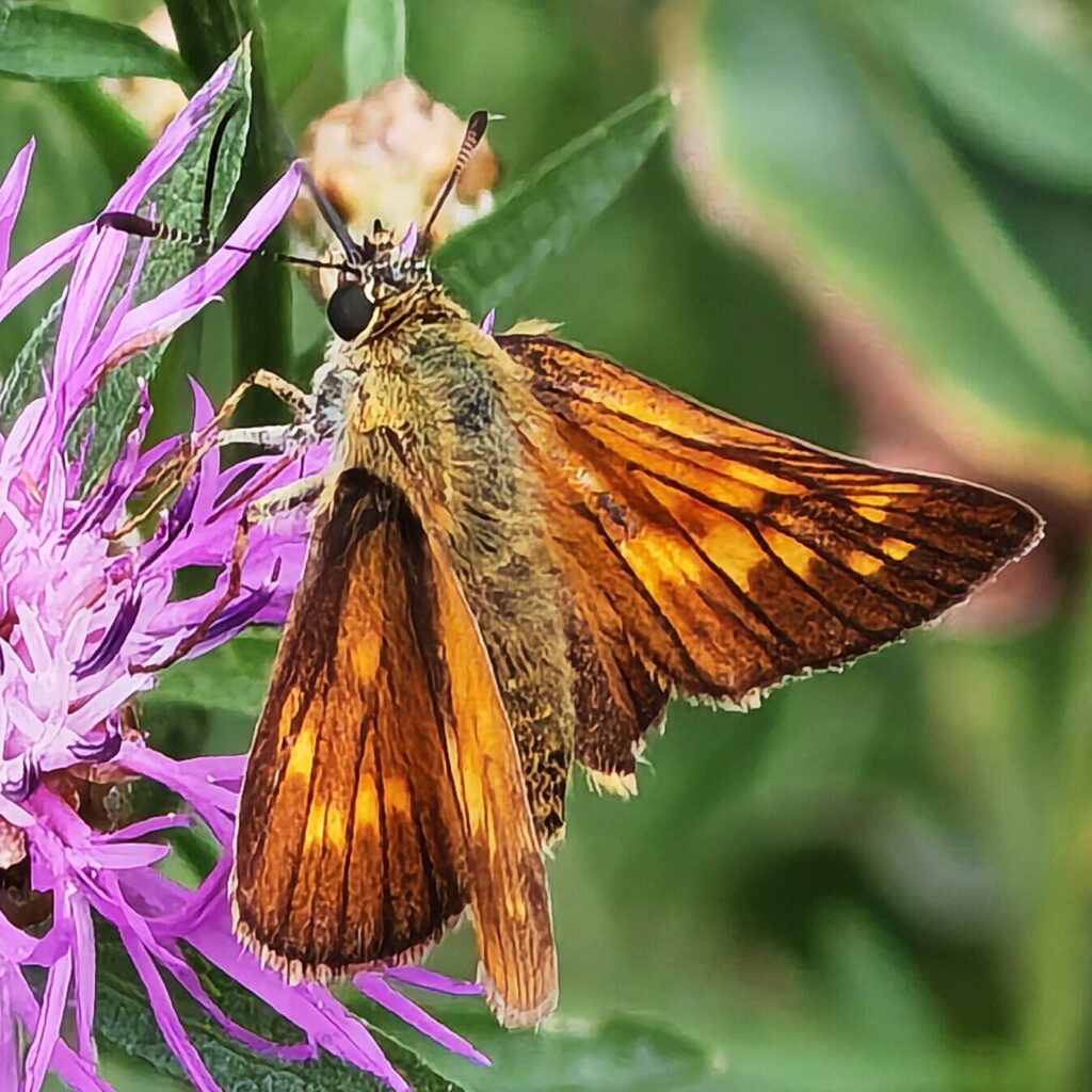 F: Distel & Doldenblüter, Sumpf-Kratzdistel, oder in trockeneren Bereichen an Gemeiner Dost, Feld-Thymian, Wiesen-Flockenblume, Skabiosen-Flockenblume, Arnika, Teufelsabbiss und Wiesen-Knöterich
